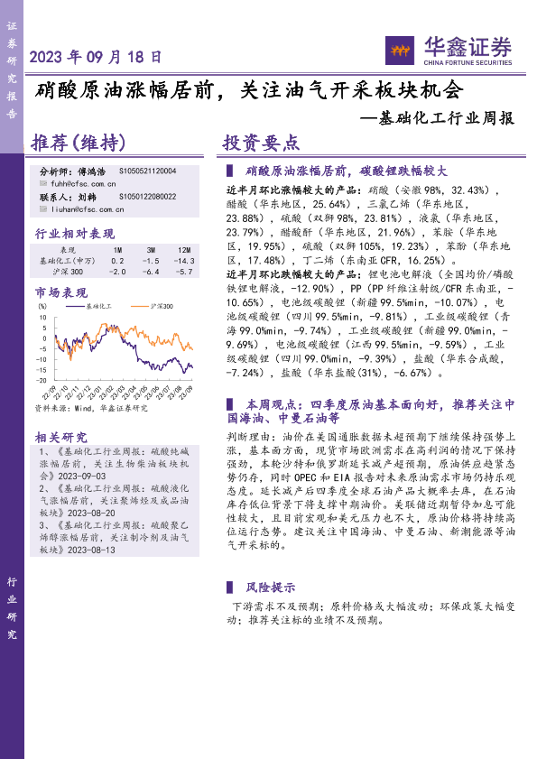 【华鑫证券】【20230918】20230918-华鑫证券-基础化工行业周报:硝酸原油涨幅居前,关注油气开采板块机会-29页