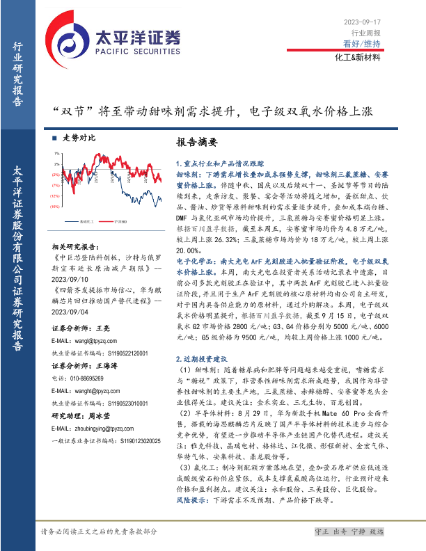 【太平洋证券】【20230917】20230917-太平洋-化工&新材料行业周报:“双节”将至带动甜味剂需求提升,电子级双氧水价格上涨-34页