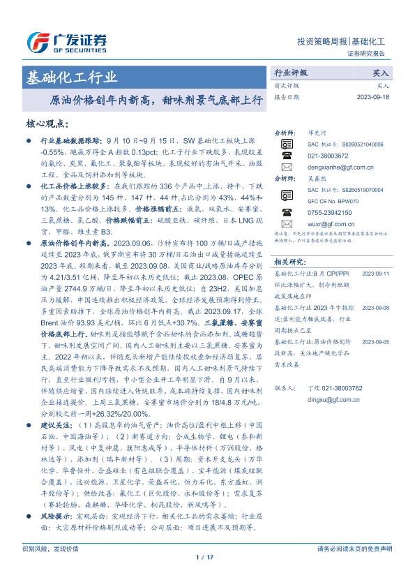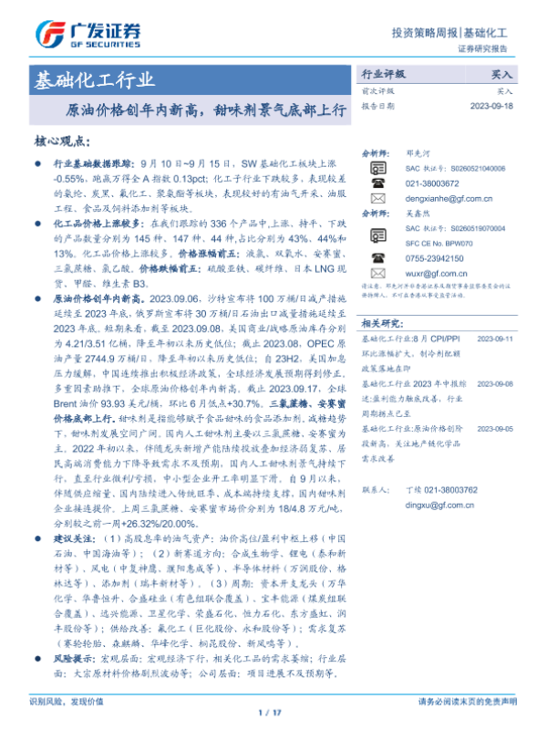 【广发证券】【20230918】20230918-广发证券-基础化工行业投资策略周报:原油价格创年内新高,甜味剂景气底部上行-17页