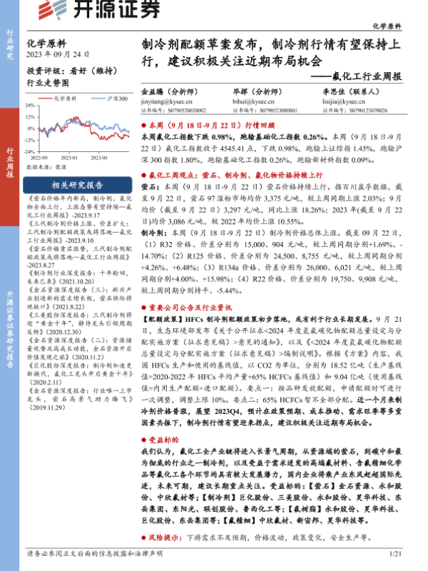 【开源证券】【20230923】20230923-开源证券-氟化工行业周报:制冷剂配额草案发布,制冷剂行情有望保持上行,建议积极关注近期布局机会-21页