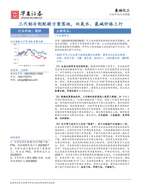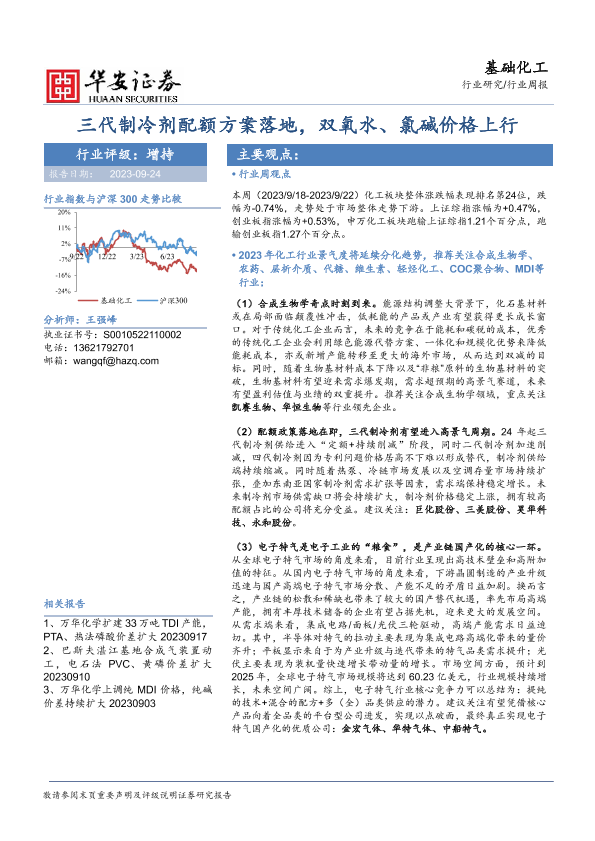 【华安证券】【20230924】20230924-华安证券-基础化工行业周报:三代制冷剂配额方案落地,双氧水、氯碱价格上行-44页