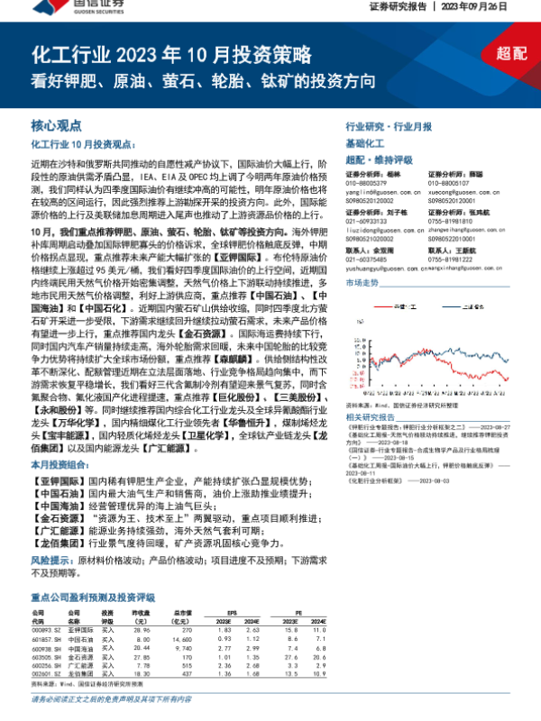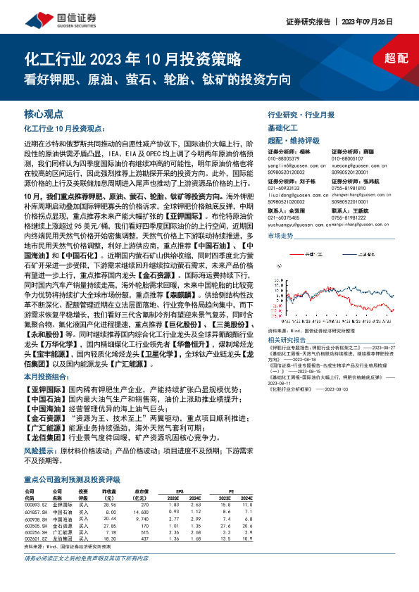 【国信证券】【20230926】化工行业2023年10月投资策略:看好钾肥、原油、萤石、轮胎、钛矿的投资方向-38页