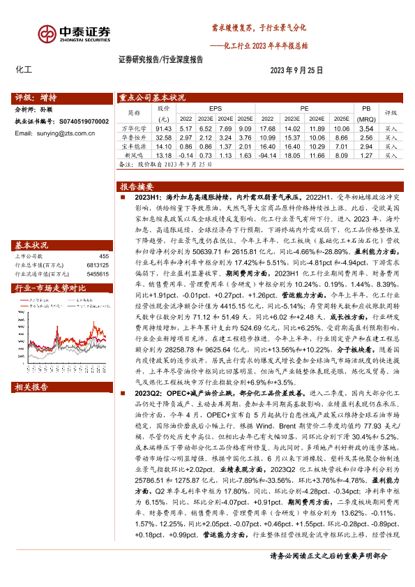 【中泰证券】【20230925】化工行业2023年半年报总结:需求缓慢复苏,子行业景气分化-33页
