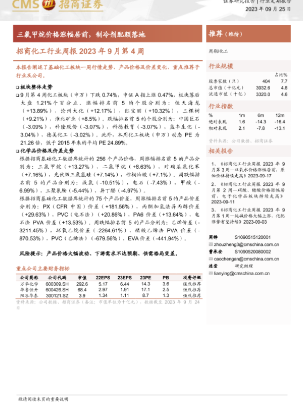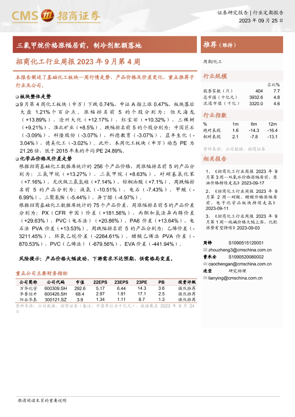 【海通证券】【20230925】招商化工行业周报2023年9月第4周:三氯甲烷价格涨幅居前,制冷剂配额落地-20页
