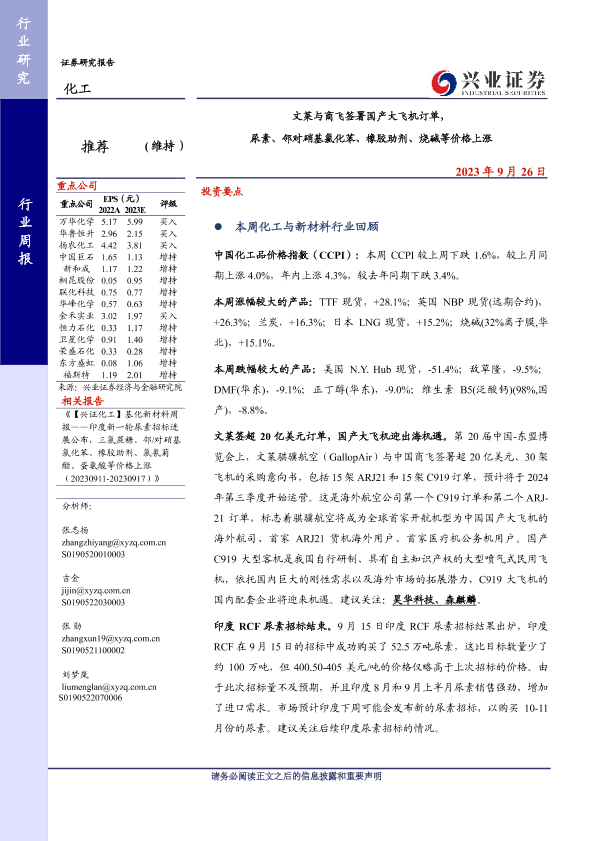 【兴业证券】【20230926】20230926-兴业证券-化工行业周报:文莱与商飞签署国产大飞机订单,尿素、邻对硝基氯化苯、橡胶助剂、烧碱等价格上涨-45页