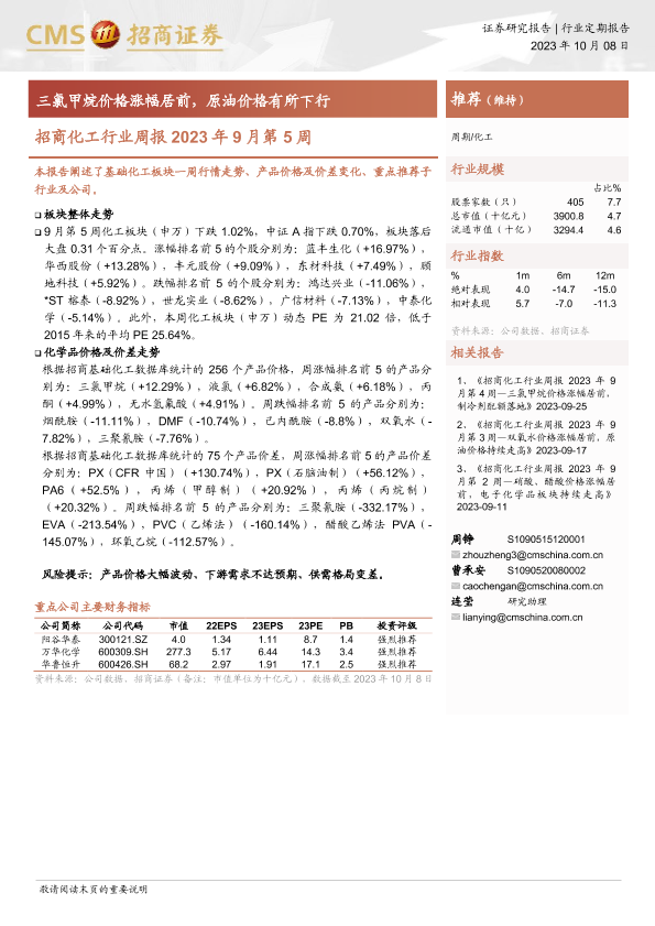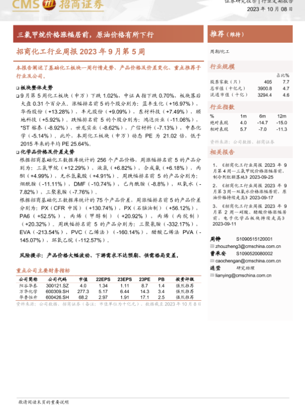【海通证券】【20231008】招商化工行业周报2023年9月第5周:三氯甲烷价格涨幅居前,原油价格有所下行-20页