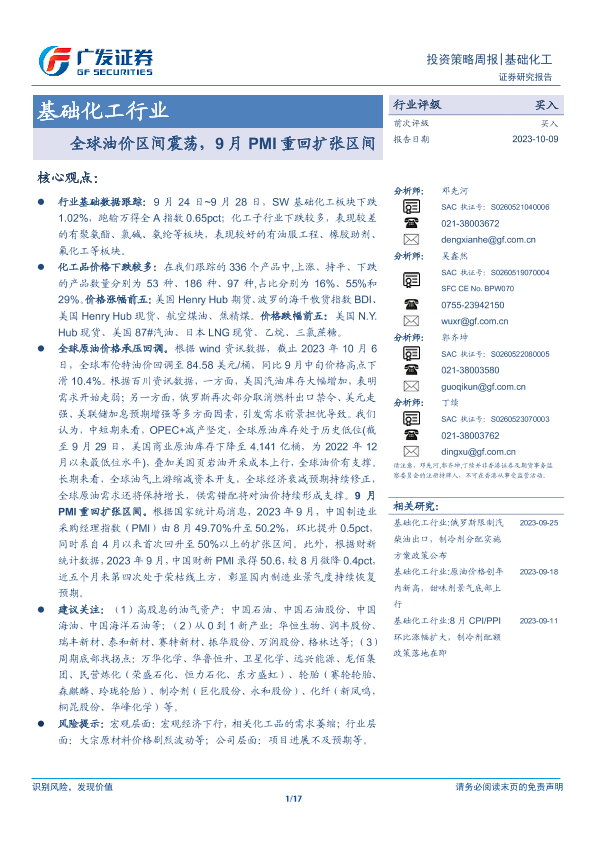 【广发证券】【20231009】20231009-广发证券-基础化工行业投资策略周报:全球油价区间震荡,9月PMI重回扩张区间-17页