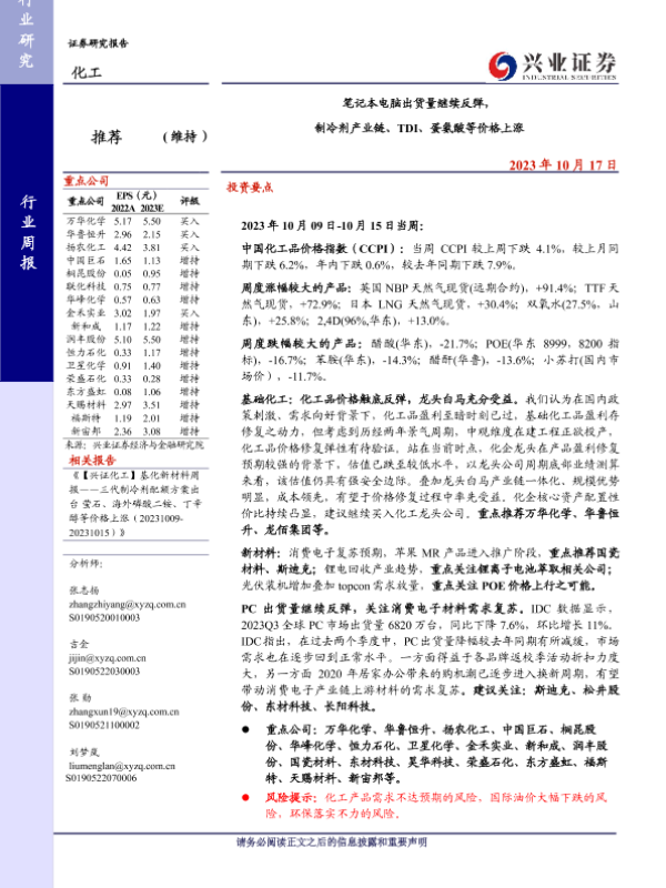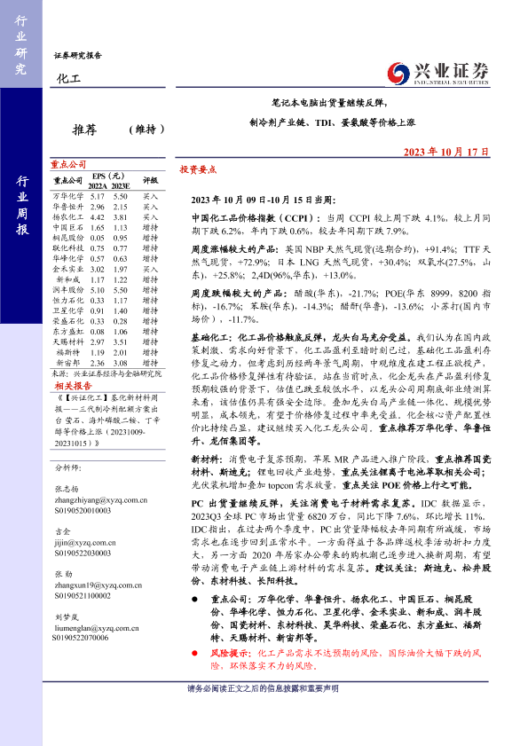【兴业证券】【20231017】20231017-兴业证券-化工行业周报:笔记本电脑出货量继续反弹,制冷剂产业链、TDI、蛋氨酸等价格上涨-44页