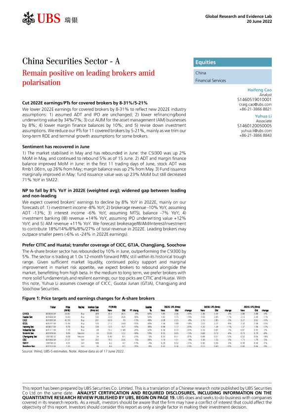 【瑞银证券有限公司】【20220620】瑞银-中国金融服务业-中国证券行业-A部分:在两极分化中保持对领先券商的看好-26页