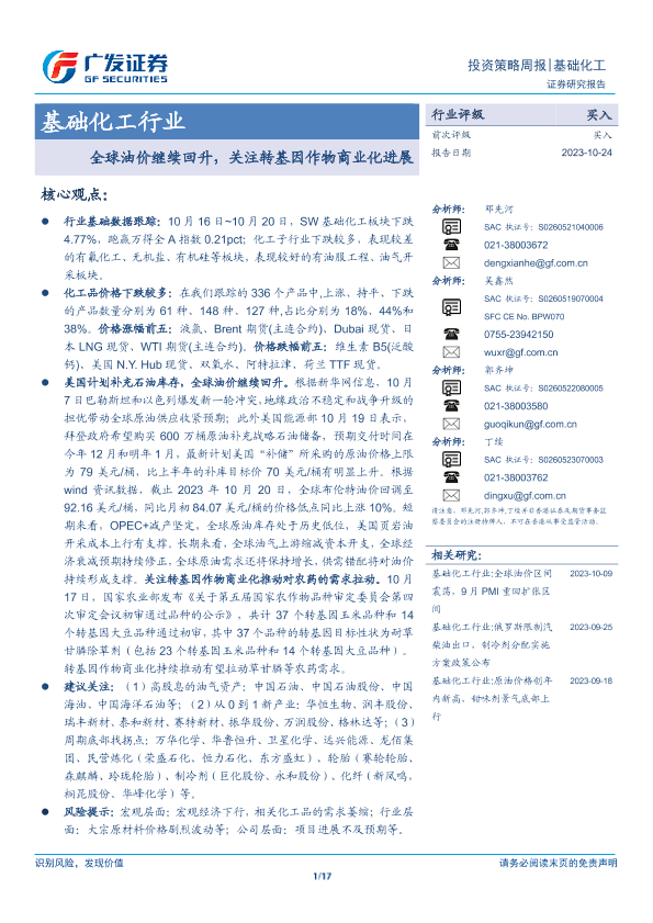【广发证券】【20231024】20231024-广发证券-基础化工行业投资策略周报:全球油价继续回升,关注转基因作物商业化进展-17页