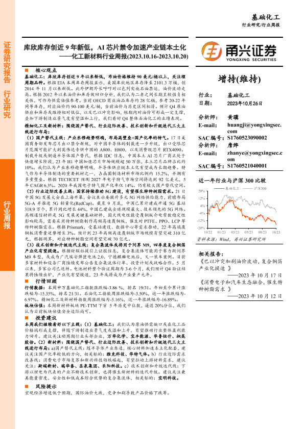【甬兴证券】【20231026】20231026-甬兴证券-化工新材料行业周报:库欣库存创近9年新低,AI芯片禁令加速产业链本土化-20页
