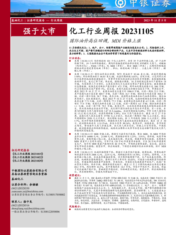 【中银证券】【20231105】20231105-中银证券-化工行业周报:国际油价高位回调,MDI价格上涨-14页