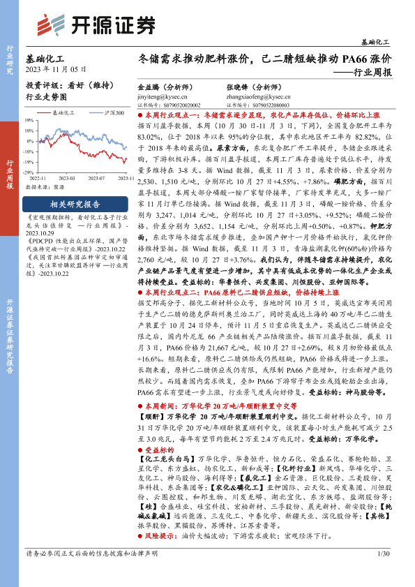 【开源证券】【20231105】20231105-开源证券-基础化工行业周报:冬储需求推动肥料涨价,己二腈短缺推动PA66涨价-30页
