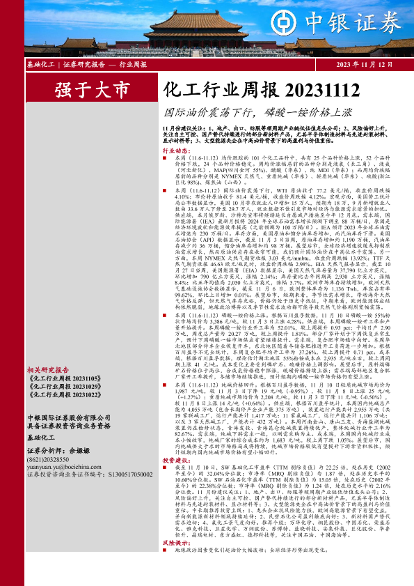 【中银证券】【20231112】20231112-中银证券-化工行业周报:国际油价震荡下行,磷酸一铵价格上涨-15页
