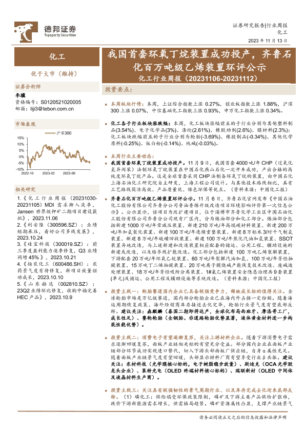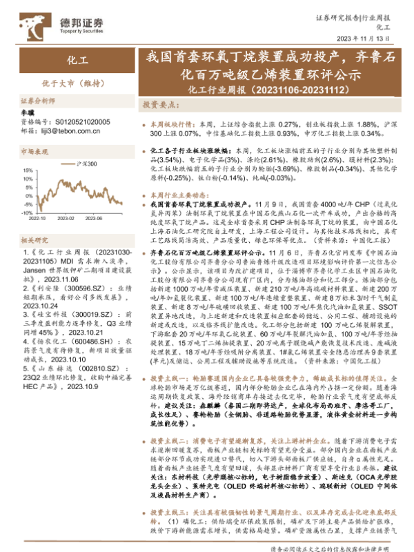 【德邦证券】【20231113】20231113-德邦证券-化工行业周报:我国首套环氧丁烷装置成功投产,齐鲁石化百万吨级乙烯装置环评公示-24页