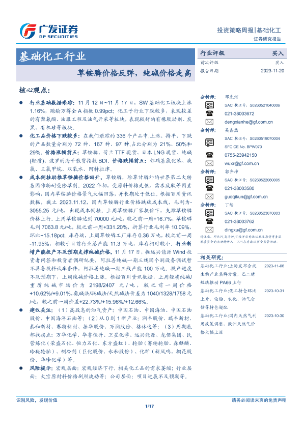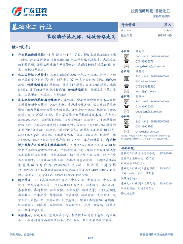 【广发证券】【20231120】20231120-广发证券-基础化工行业投资策略周报:草铵膦价格反弹,纯碱价格走高-17页