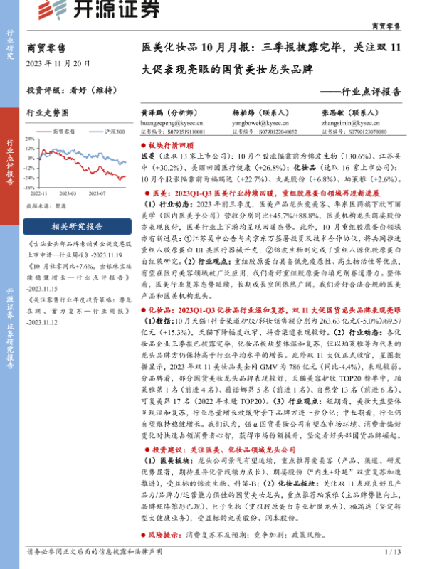 【开源证券】【20231120】20231120-开源证券-医美化妆品10月月报:三季报披露完毕,关注双11大促表现亮眼的国货美妆龙头品牌-13页
