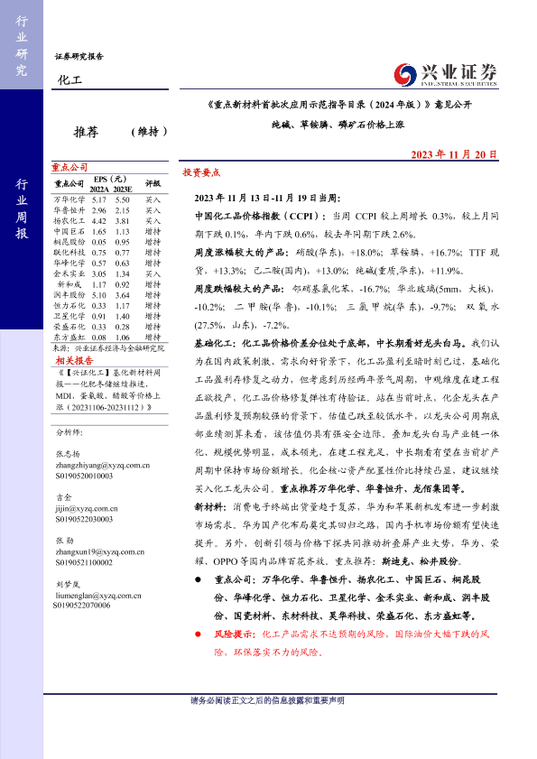 【兴业证券】【20231120】化工行业周报:《重点新材料首批次应用示范指导目录(2024年版)》意见公开-纯碱、草铵膦、磷矿石价格上涨-43页