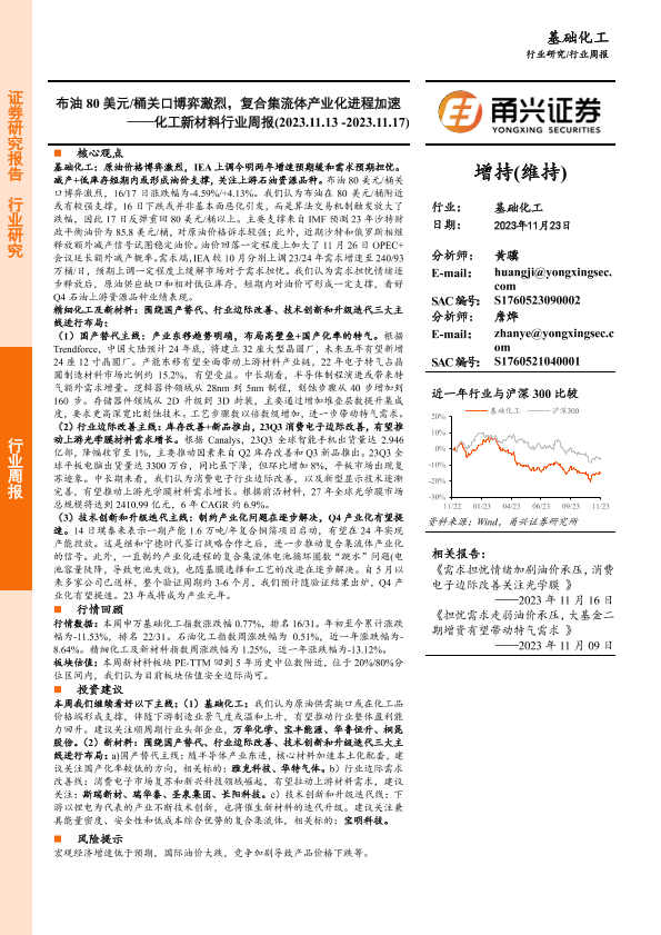 【甬兴证券】【20231123】20231123-甬兴证券-化工新材料行业周报:布油80美元 桶关口博弈激烈,复合集流体产业化进程加速-20页