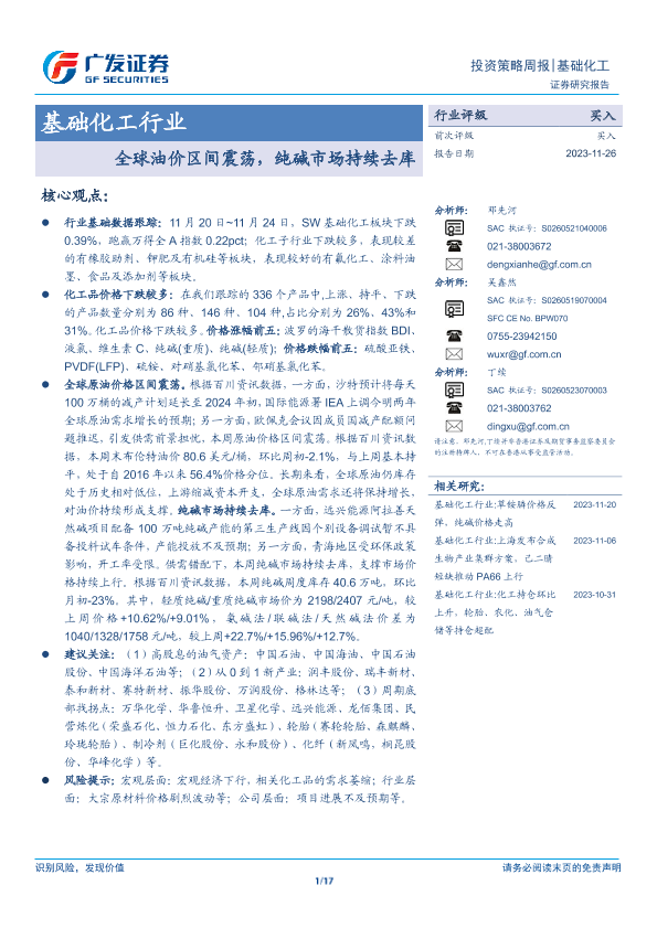 【广发证券】【20231126】20231126-广发证券-基础化工行业投资策略周报:全球油价区间震荡,纯碱市场持续去库-17页