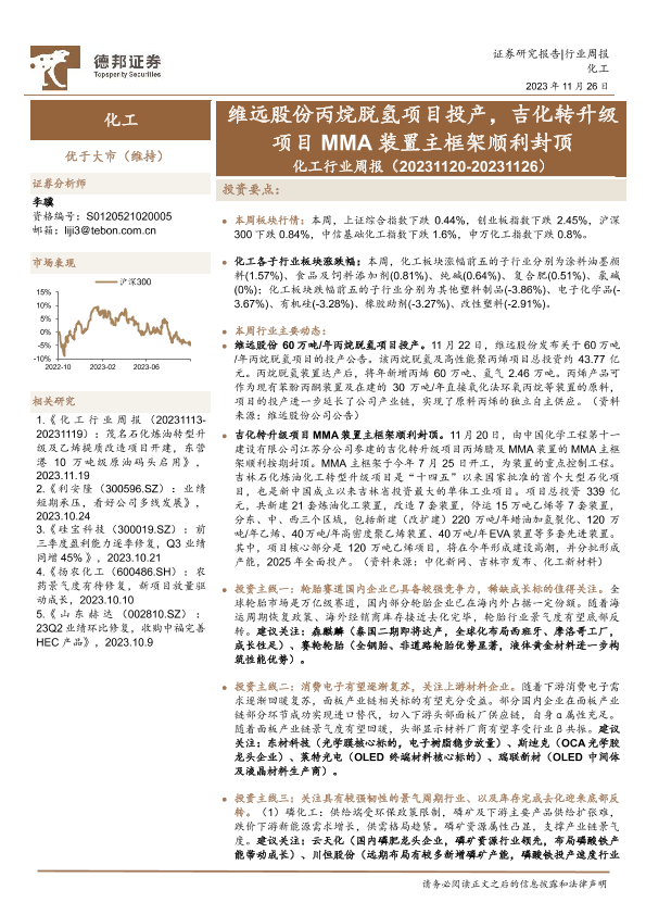 【德邦证券】【20231126】20231126-德邦证券-化工行业周报:维远股份丙烷脱氢项目投产,吉化转升级项目MMA装置主框架顺利封顶-24页
