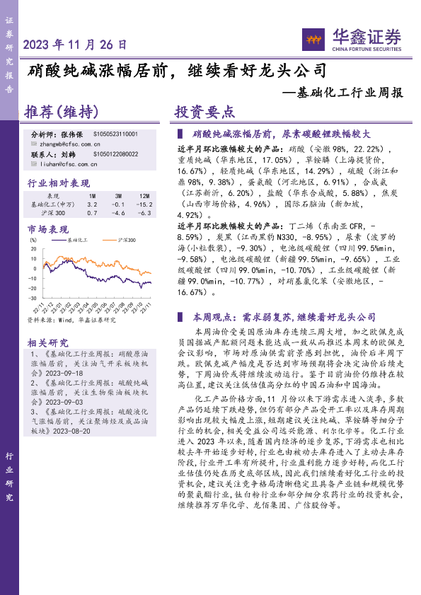 【华鑫证券】【20231126】20231126-华鑫证券-基础化工行业周报:硝酸纯碱涨幅居前,继续看好龙头公司-24页