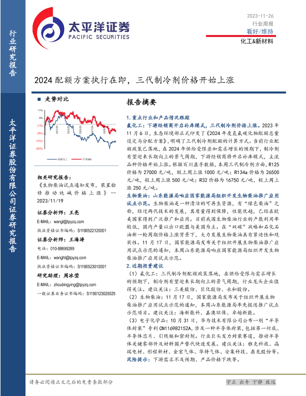 【太平洋证券】【20231126】20231126-太平洋-化工&新材料行业周报:2024配额方案执行在即,三代制冷剂价格开始上涨-38页