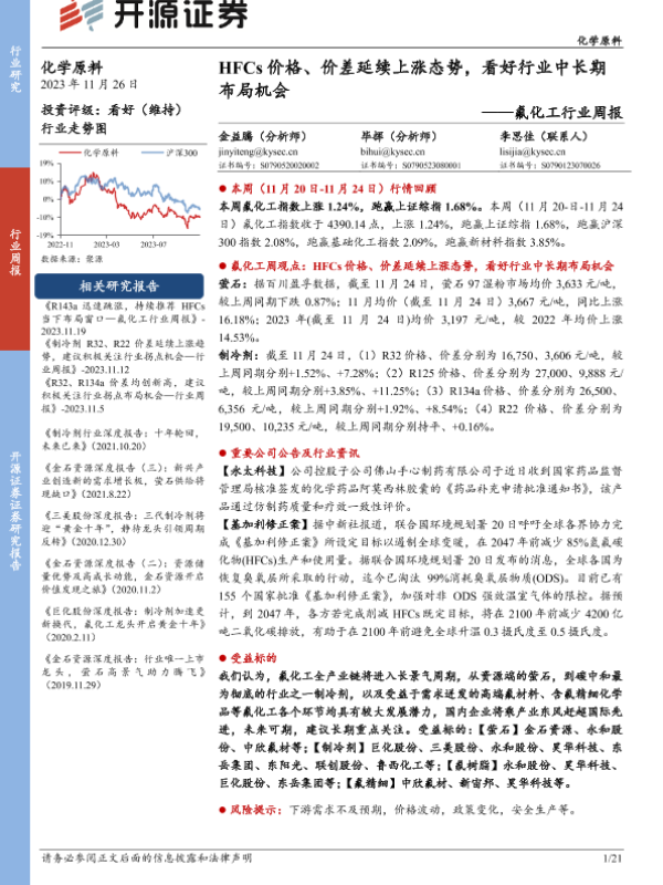 【开源证券】【20231126】20231126-开源证券-氟化工行业周报:HFCs价格、价差延续上涨态势,看好行业中长期布局机会-21页