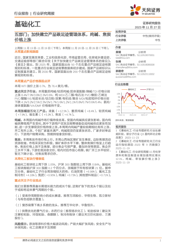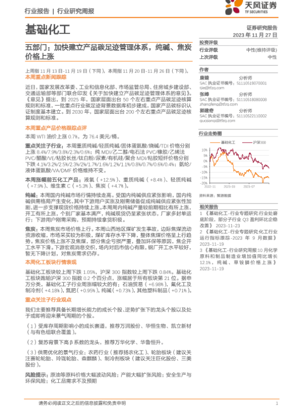 【天风证券】【20231127】基础化工行业研究周报:五部门:加快建立产品碳足迹管理体系,纯碱、焦炭价格上涨-20页