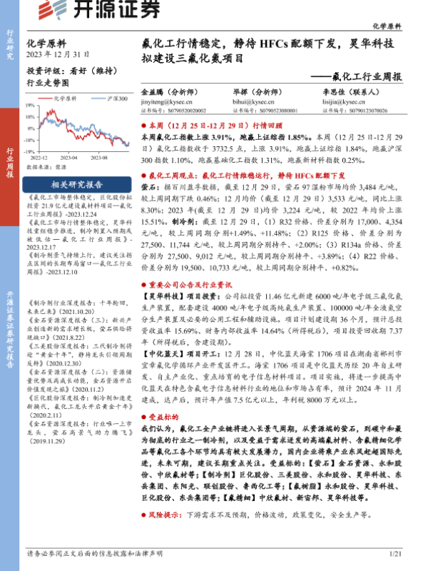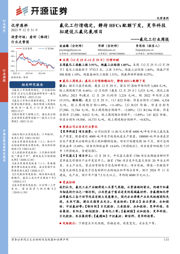 【开源证券】【20231231】氟化工市场整体稳定,静待HFCs配额下发,昊华科技拟建设三氟化氮项目-21页