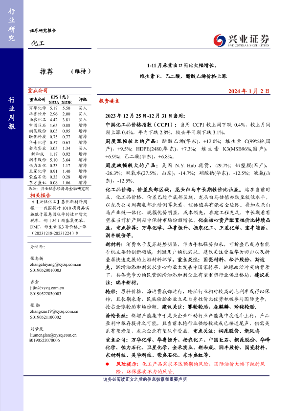 【兴业证券】【20240102】20240102-兴业证券-化工行业周报:1-11月尿素出口同比大幅增长,维生素E、己二酸、醋酸乙烯价格上涨-43页