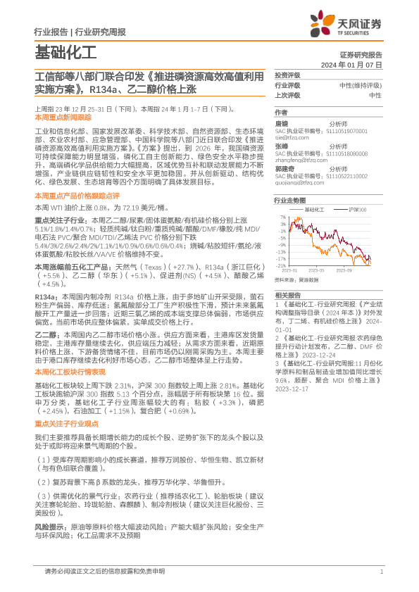 【天风证券】【20240107】基础化工行业研究周报:工信部等八部门联合印发《推进磷资源高效高值利用实施方案》,R134a、乙二醇价格上涨-20页