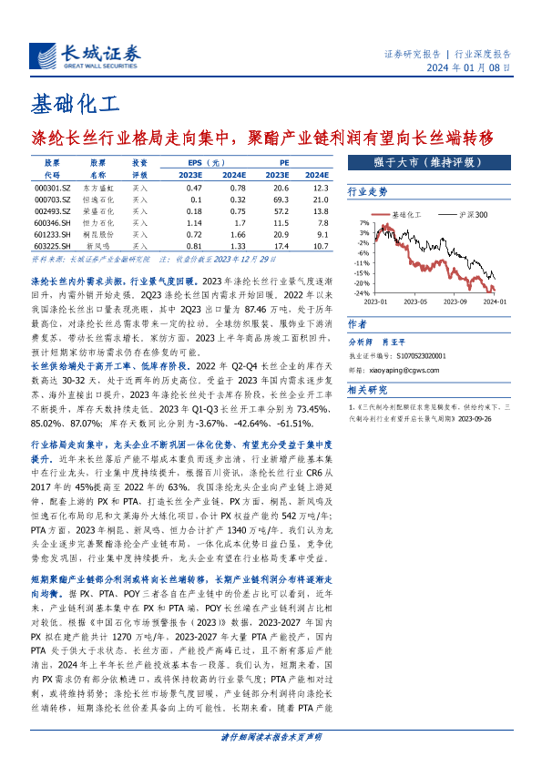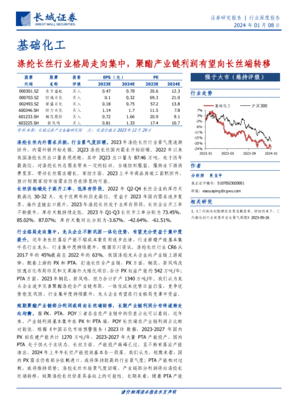 【长城证券】【20240108】基础化工:涤纶长丝行业格局走向集中,聚酯产业链利润有望向长丝端转移-26页