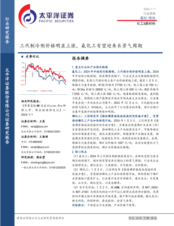 【太平洋证券】【20240107】20240107-太平洋-化工&新材料行业周报:三代制冷剂价格明显上涨,氟化工有望迎来长景气周期-37页