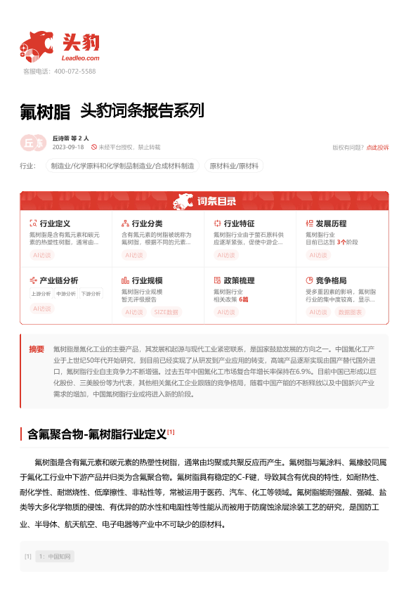 【头豹研究院】【20230918】20240111-头豹研究院-氟树脂 头豹词条报告系列-21页