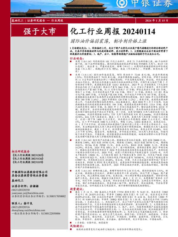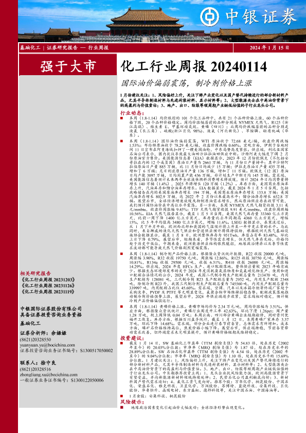 【中银证券】【20240115】20240115-中银证券-化工行业周报:国际油价偏弱震荡,制冷剂价格上涨-14页