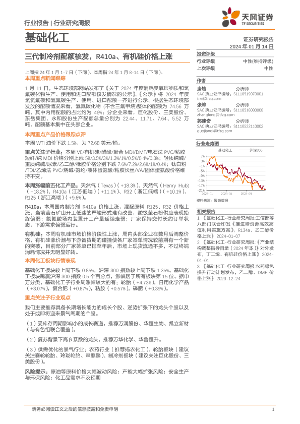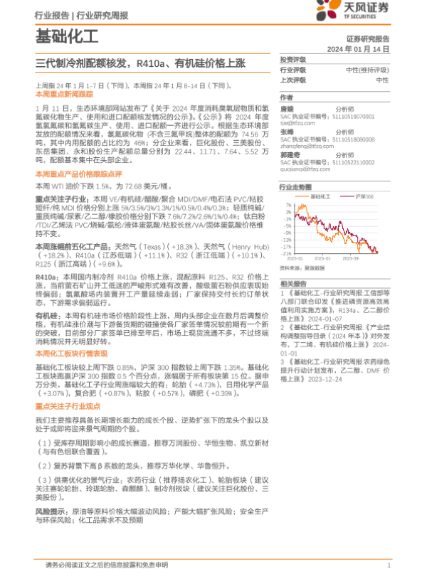 【天风证券】【20240114】20240114-天风证券-基础化工行业研究周报:三代制冷剂配额核发,R410a、有机硅价格上涨-20页