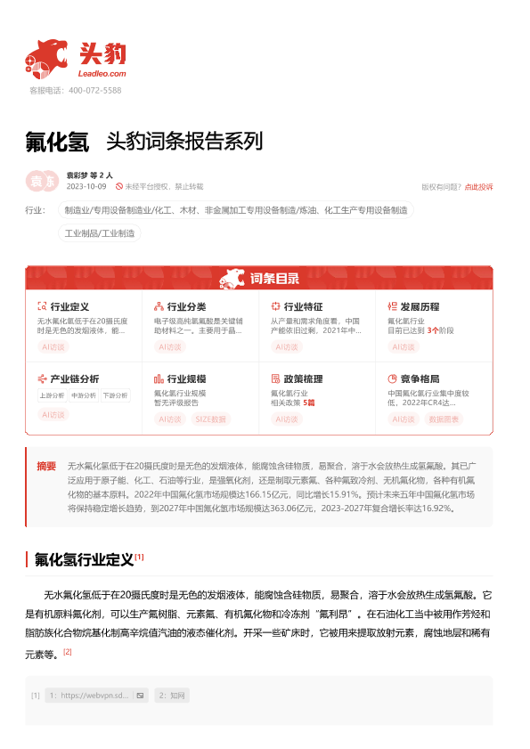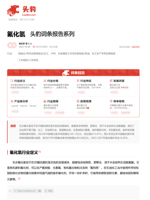 【头豹研究院】【20231009】20240115-头豹研究院-氟化氢 头豹词条报告系列-18页