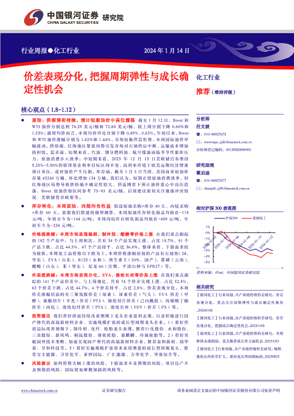 【银河证券】【20240114】20240114-中国银河-化工行业行业周报:价差表现分化,把握周期弹性与成长确定性机会-18页