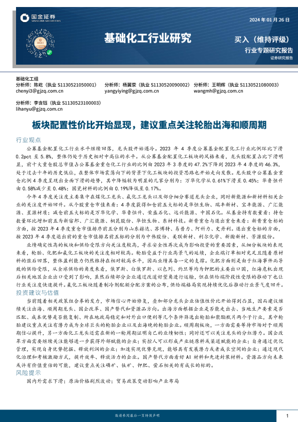 【国金证券】【20240126】20240126-国金证券-基础化工行业研究:板块配置性价比开始显现,建议重点关注轮胎出海和顺周期-17页