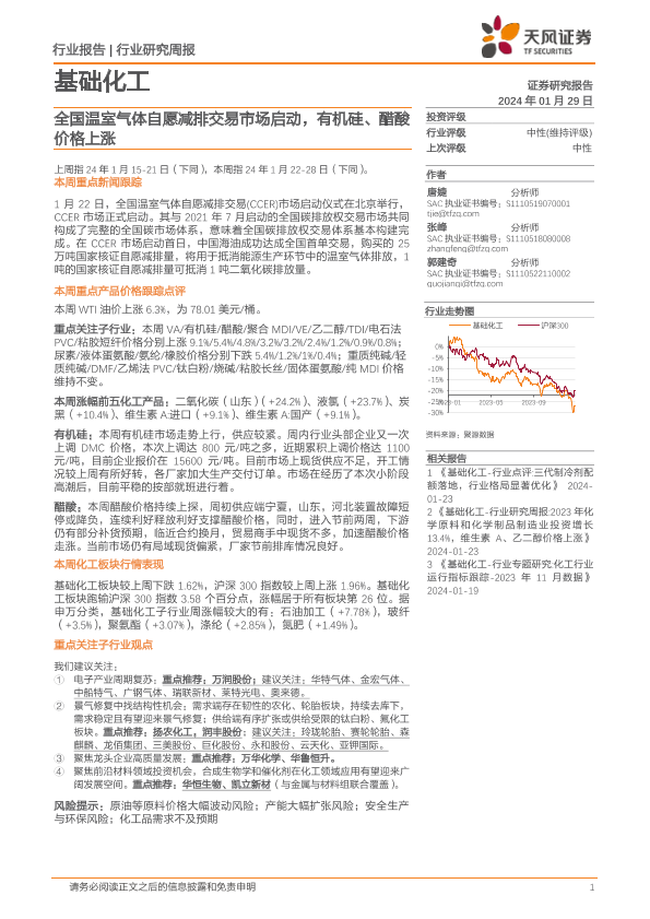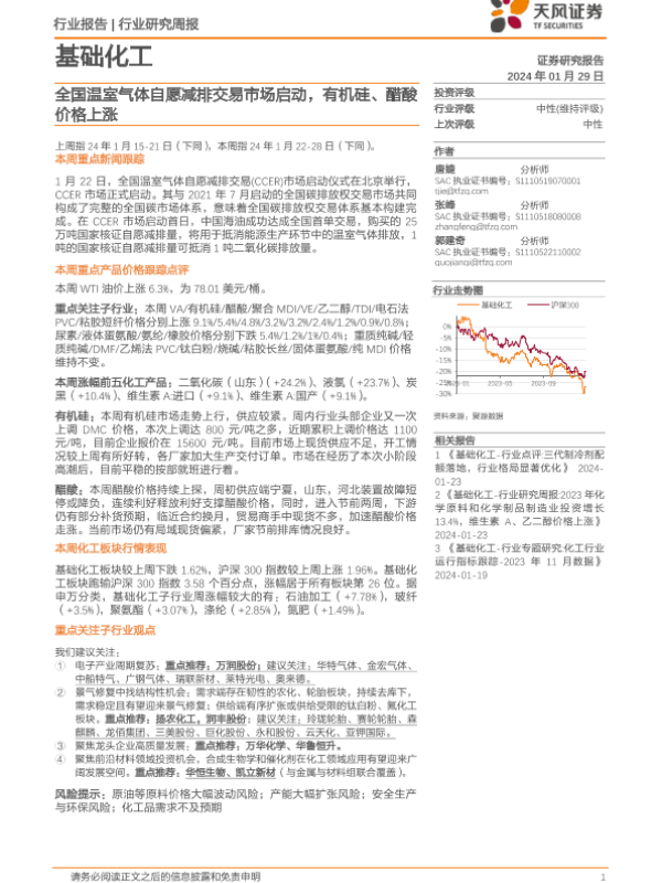 【天风证券】【20240129】基础化工行业研究周报:全国温室气体自愿减排交易市场启动,有机硅、醋酸价格上涨-20页