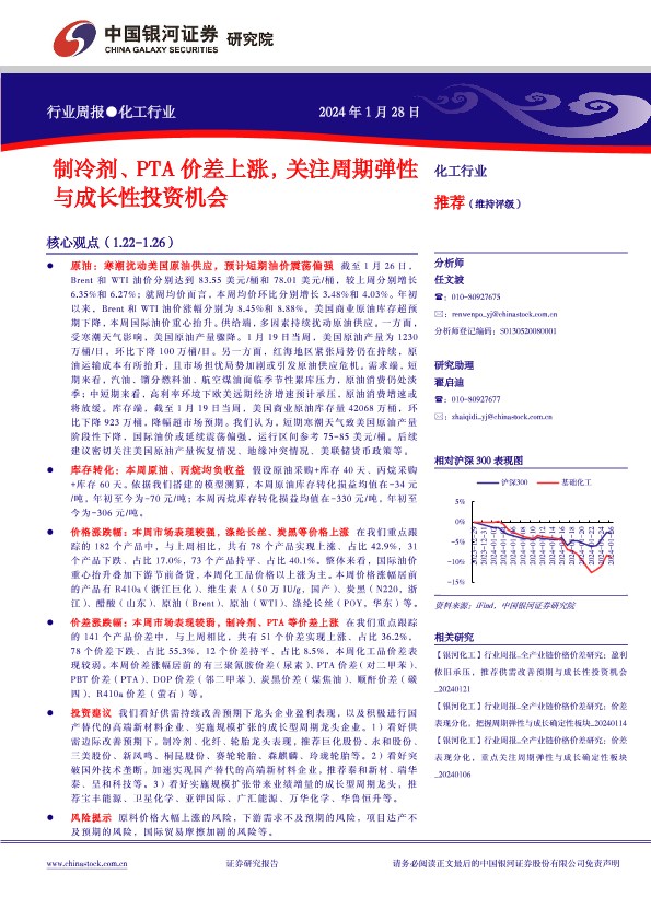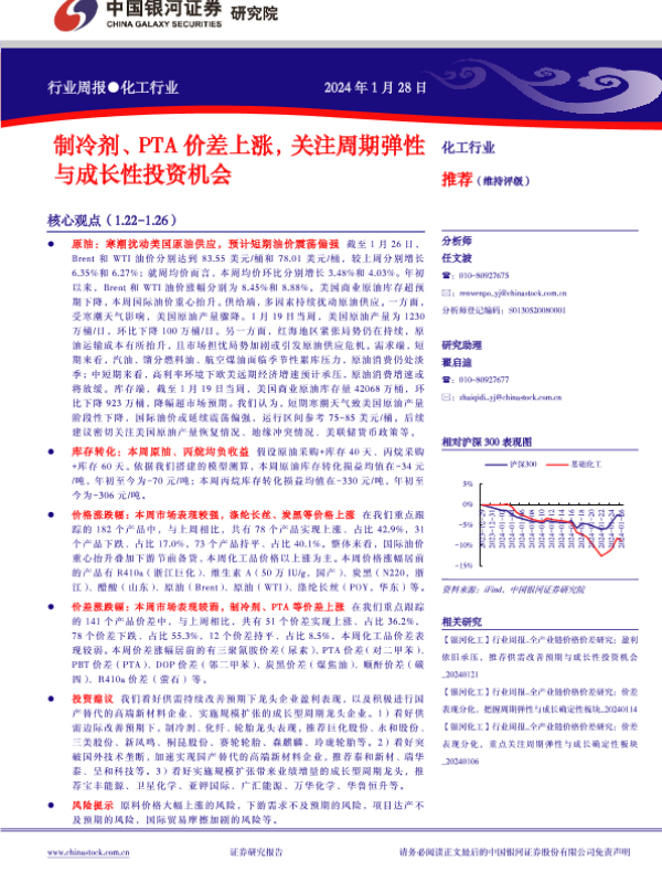 【银河证券】【20240128】20240128-中国银河-化工行业行业周报:制冷剂、PTA价差上涨,关注周期弹性与成长性投资机会-18页
