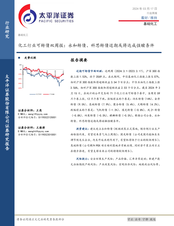 【太平洋证券】【20240317】20240317-太平洋-化工行业可转债双周报:永和转债、科思转债近期或将达成强赎条件-15页