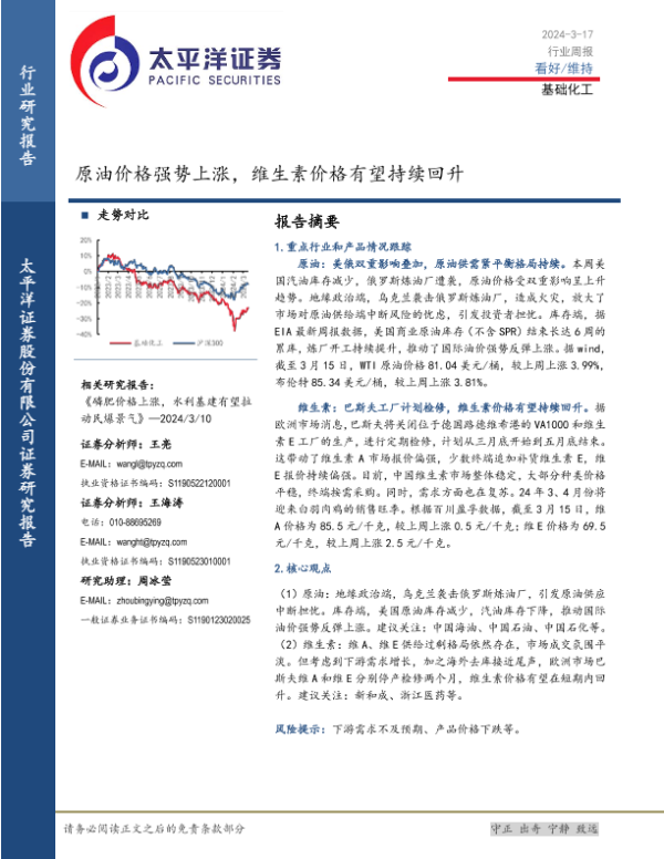 【太平洋证券】【20240317】20240317-太平洋-基础化工行业周报:原油价格强势上涨,维生素价格有望持续回升-31页
