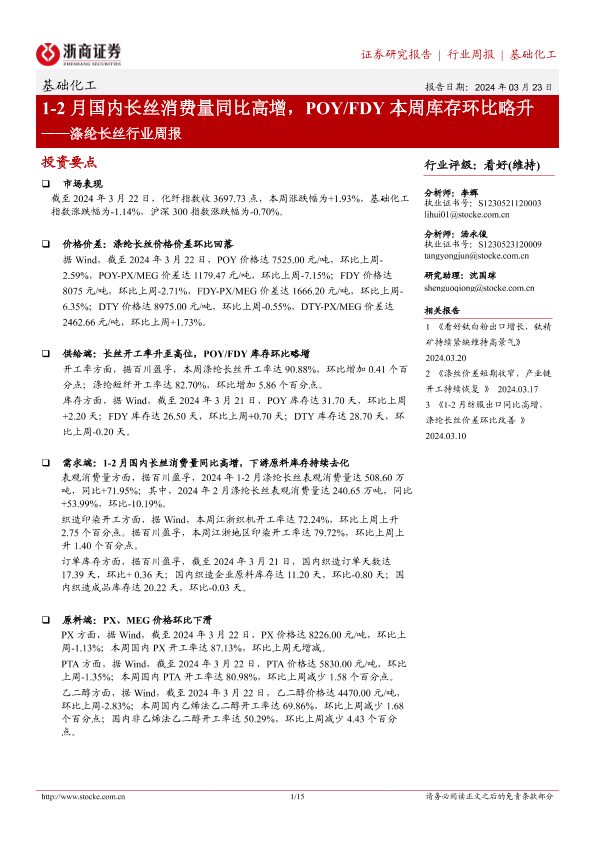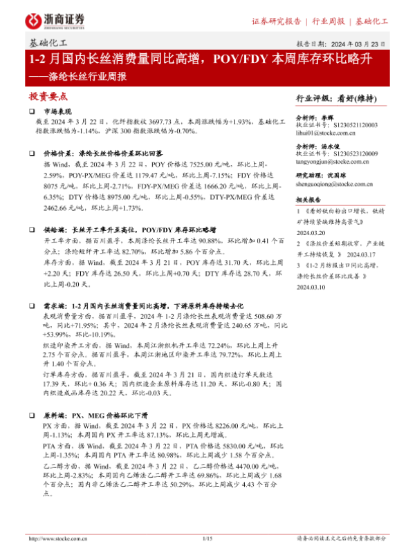 【浙商证券】【20240323】20240323-浙商证券-涤纶长丝行业周报:1-2月国内长丝消费量同比高增,POY FDY本周库存环比略升-15页