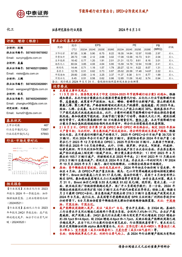 【中泰证券】【20240603】20240603-中泰证券-化工行业周报:节能降碳行动方案出台;OPEC+分阶段延长减产-39页