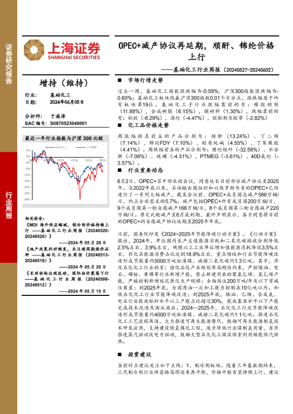 【上海证券】【20240605】20240605-上海证券-基础化工行业周报:OPEC+减产协议再延期,顺酐、锦纶价格上行-13页