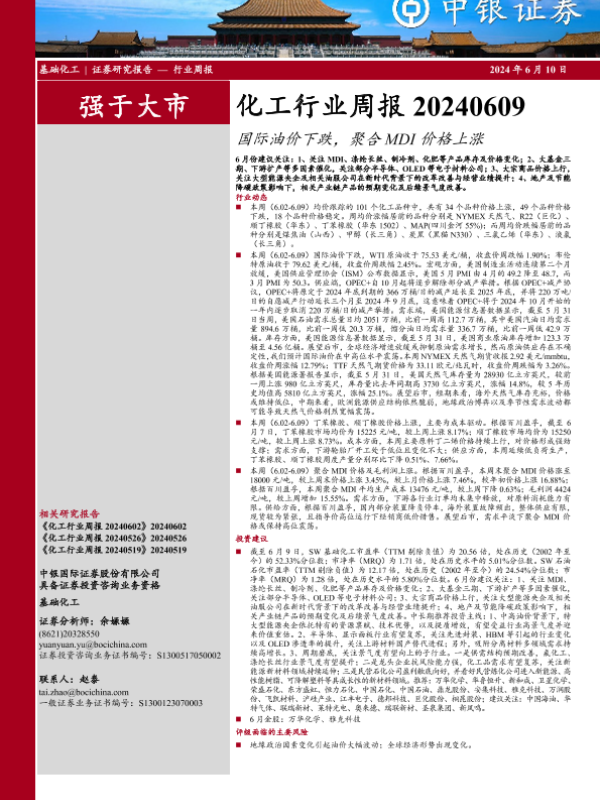 【中银证券】【20240610】20240610-中银证券-化工行业周报:国际油价下跌,聚合MDI价格上涨-14页