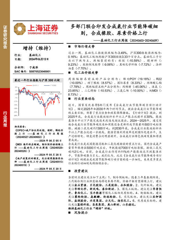 【上海证券】【20240612】20240612-上海证券-基础化工行业周报:多部门联合印发合成氨行业节能降碳细则,合成橡胶、尿素价格上行-13页
