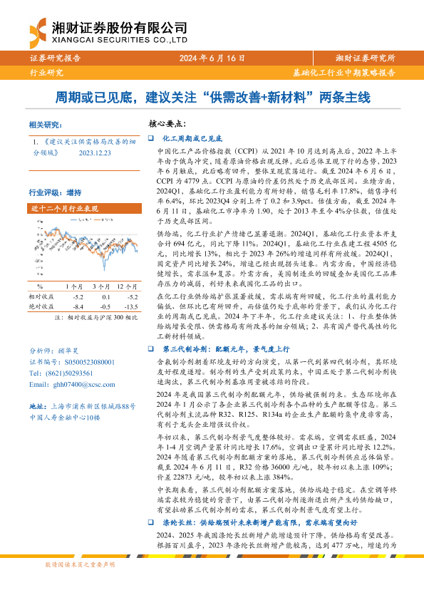 【湘财证券】【20240616】基础化工行业中期策略报告:周期或已见底,建议关注“供需改善+新材料”两条主线-31页